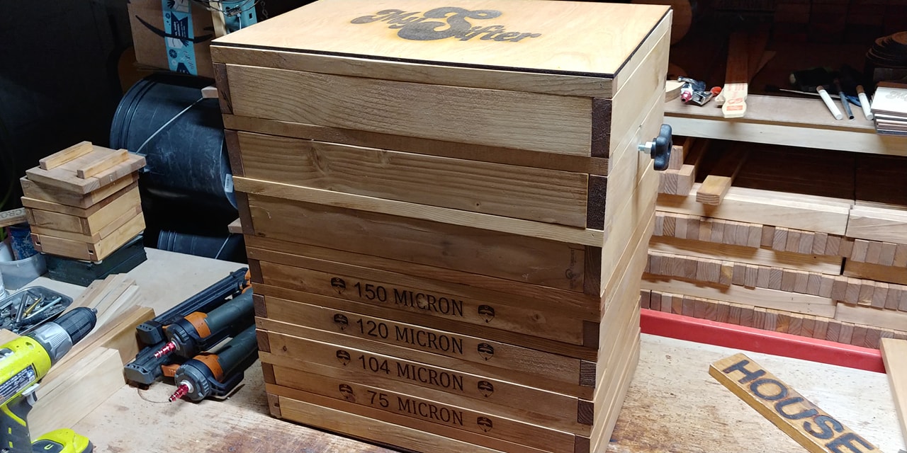 And below the Tumbler are (4) 12 x 18 screens—150micron-120micron-104micron and a 75 micron bottom screen with a REAL GLASS MIRROR at the base to catch all them trichomes!